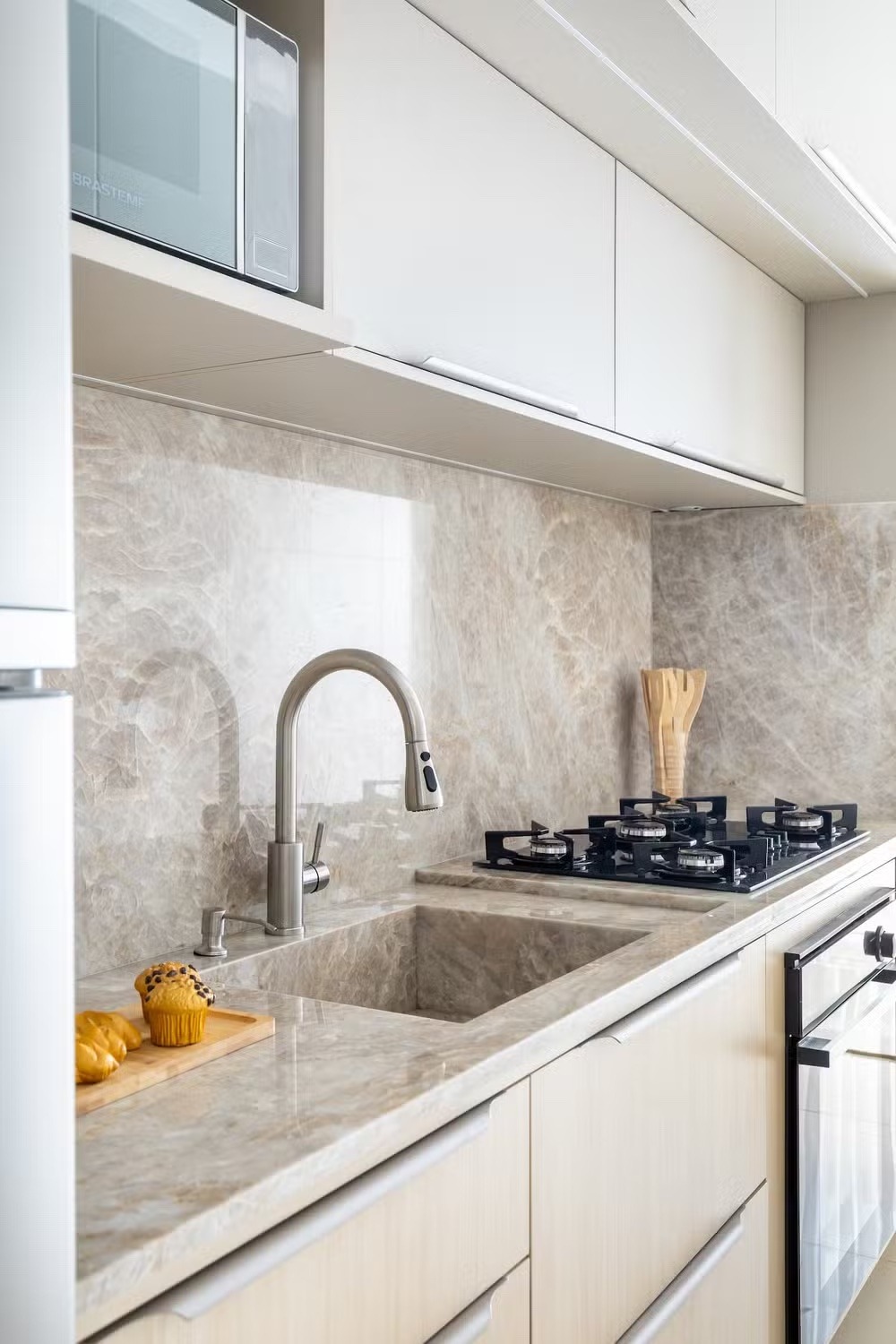 COZINHA | Bancada em Taj Mahal com cuba esculpida. O front da cozinha é no mesmo material. Marcenaria de Antoine Design — Foto: Mariana Henriques/Divulgação