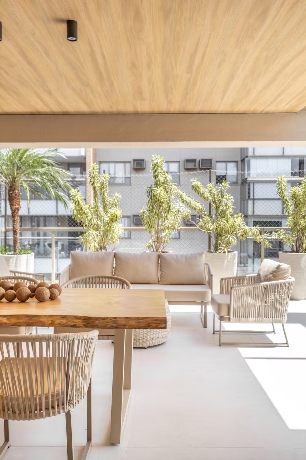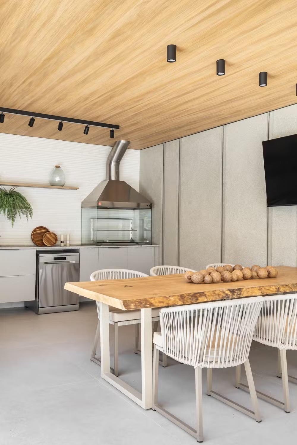 A área externa também conta com uma parede em drywall com textura de microsseixos e iluminação LED. “O teto vinílico na área gourmet trouxe aconchego, enquanto o paisagismo foi projetado para complementar a estética”, afirma Shayanne.